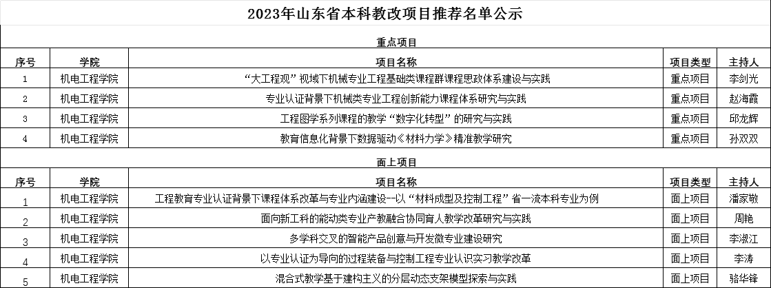 根据学校《关于组织开展2023年山东省本科教学改革研究项目立项申报和管理工作的通知》要求,澳门十大信誉好的网站组织开展了省级教改项目申报工作,经项目负责人个人申报,校内专家评审,共拟推荐重点项目4项,面上项目5项,至学校,进行下一步评审。现将结果公示如下: