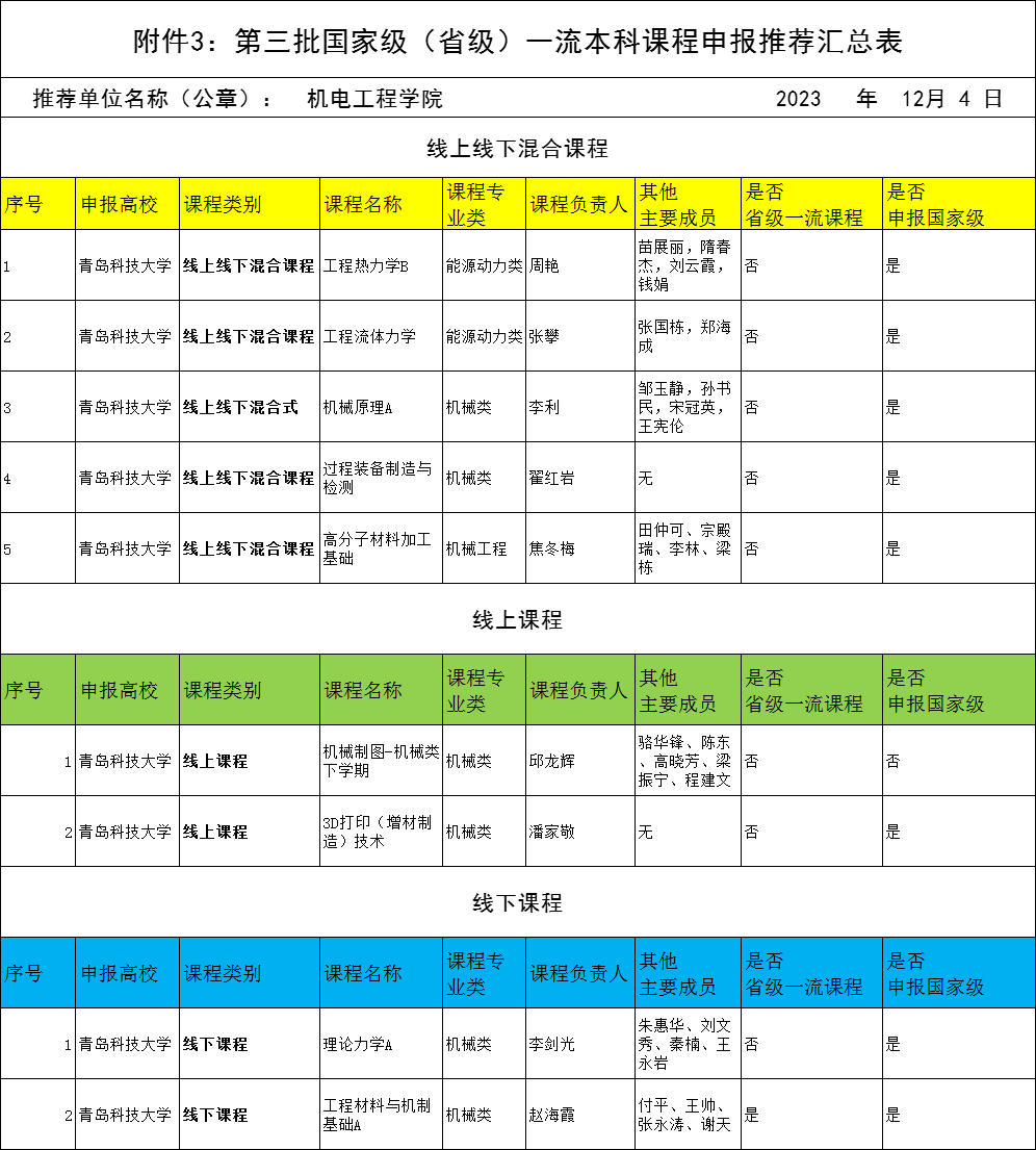 依据学校《关于开展青岛科技大学第三批山东省一流本科课程申报工作的预备通知》,学院组织符合条件的教师申报,共有9位教师提交材料,经院外专家评审,现拟推荐以下课程进入学校评审环节,并进行公示。公示期三天(2023年12月4日-12月6日),如有异议,请在公示期内向澳门十大信誉好的网站教学办反映。