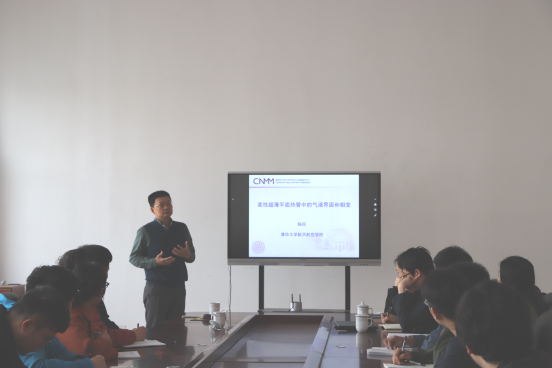 会上,李庆领代表学校对陈民教授的到来表示热烈欢迎,并对陈民在相变传热和分子动力学模拟领域取得的重要成果做了介绍。随后,陈民做了题为《柔性超薄平面热管中的气液界面和相变》报告。报告中详细介绍了超薄热管的前沿科技并对热管中气液相变问题进行具体阐述,通过非平衡分子动力学模拟方法,得到相变物质在不同温度和非平衡程度下的凝结系数,根据HSK公式推导出可应用于CFS计算的蒸发凝结新模型,陈民还就分子动力学的应用领域和如何从工程实际中凝练出基础研究课题等问题为大家分享经验。会后,与会师生结合报告内容和自身科研过程中存在的问题与陈教授进行了深入探讨。