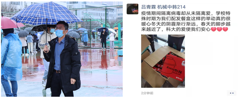 学院贯彻落实上级部署,全面开展校园防疫工作。各级领导,学生干部队伍24小时开机待命,辅导员入住学生宿舍,了解学生诉求,第一时间为学生解决困难,保障同学们疫情期间的正常生活。辅导员们主动承担起隔离送餐员的任务,确保被隔离学生的正常生活。根据上级领导指示,学校全面取消堂食,并为学生免费发放不锈钢饭盒,解决同学们的用餐问题。