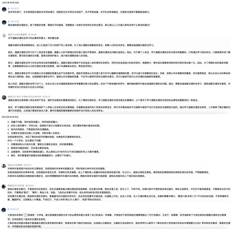在学生骨干工作群中,同学们展开了关于校园交通安全的大讨论。大家围绕道路交通安全规范、开展安全学习的必要性、道路交通安全注意事项等内容开展讨论,并就如何规范校园交通管理提出了意见和建议。本次大讨论提升了同学们的“主人翁”意识,进一步激励同学们争做文明交通的参与者和文明出行的践行者。