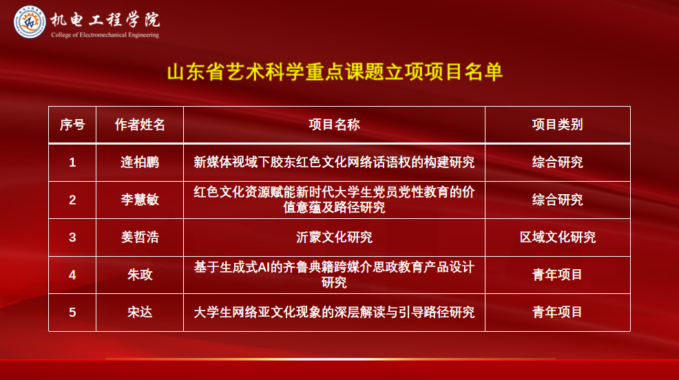 近日,山东省文化艺术科学协会公布了2025年度山东省艺术科学重点课题等立项项目名单,学院共获立项项目5项。其中综合研究立项2项,区域文化研究立项1项,青年项目立项2项,立项数量创历史新高。