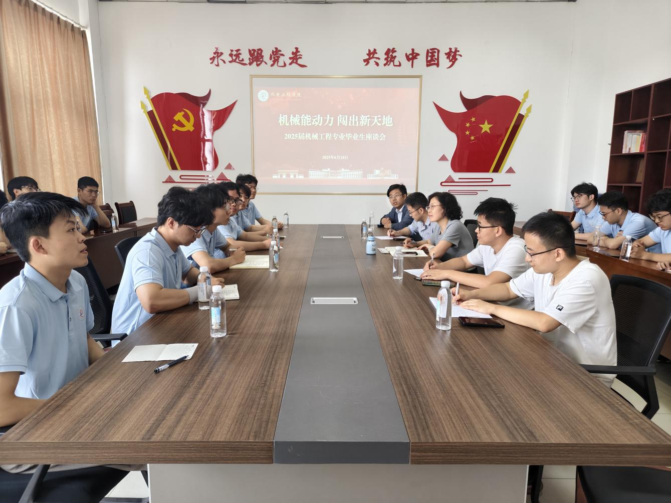 6月18日下午,机械工程专业2025届毕业生座谈会在机电楼529会议室举行,机械工程专业负责人兼机自系主任赵海霞、高机系主任张德伟、机自系副主任张永涛、特聘副教授谷永振以及机械专业辅导员于超、2025届机械工程专业毕业生代表参加了座谈会,会议由赵海霞主持。