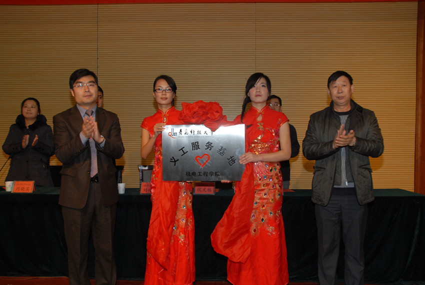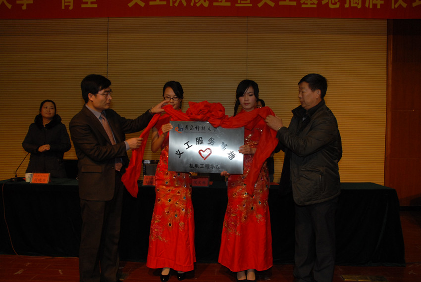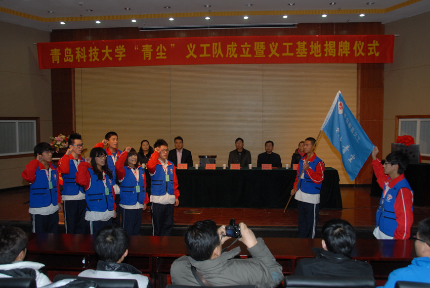 青岛科技大学团委书记刘传华与青岛市慈善总会宣传部部长侯文栋共同为义工基地揭牌。澳门十大信誉好的网站党总支副书记兼副院长张霄为“青尘”义工队授旗。