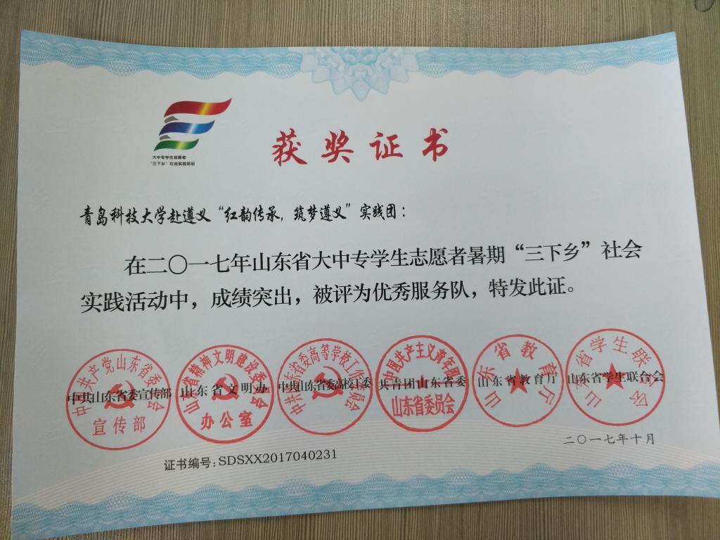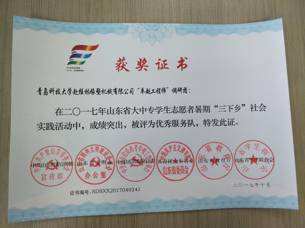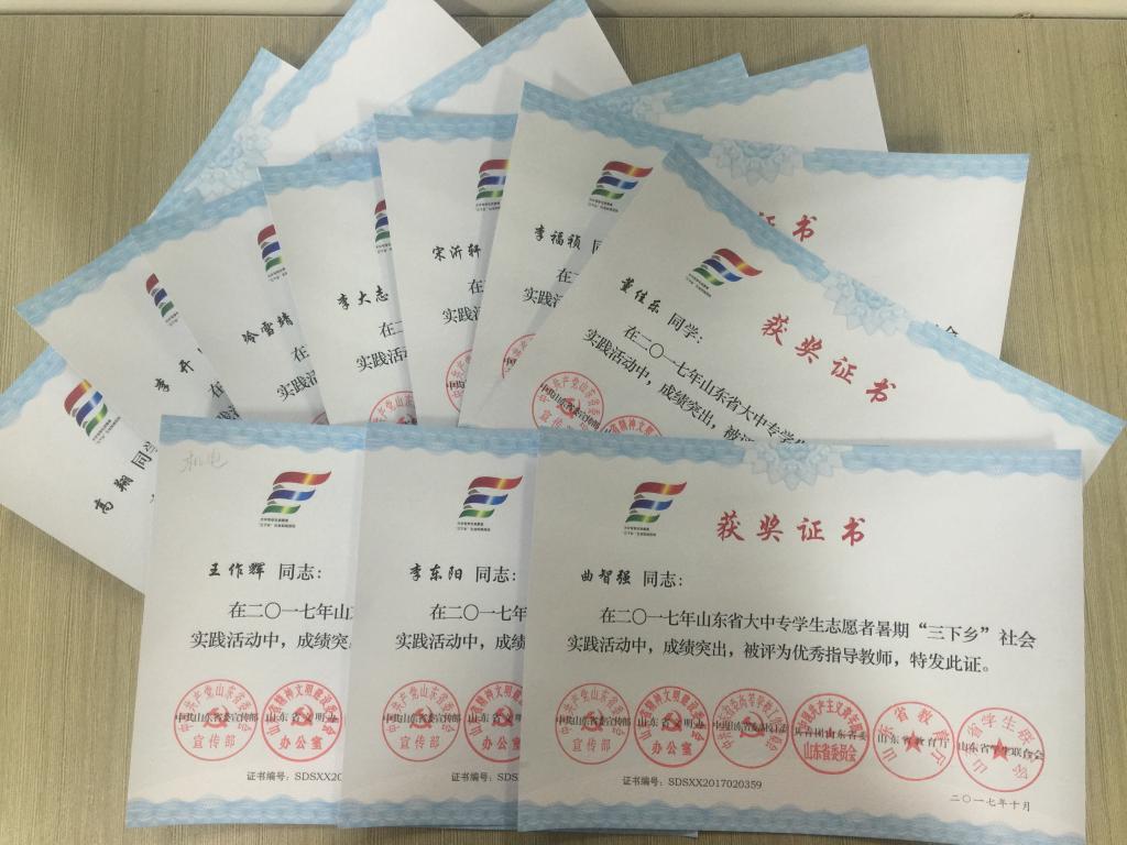 近日,2017年山东省大中专学生志愿者暑期文化科技卫生“三下乡”社会实践活动先进集体和先进个人的证书下发,澳门十大信誉好的网站赴桂林橡塑机械有限公司“卓越工程师”调研团、赴遵义“红韵传承,筑梦遵义”实践团2支队伍获得2017年山东省优秀服务队称号,王作辉、曲智强、李东阳被评为2017年山东省社会实践活动优秀指导教师,高翔、李开、冷雪靖、李大志、宋沂轩、李福祯、董佳乐7名学生荣获2017年山东省社会实践活动优秀学生。