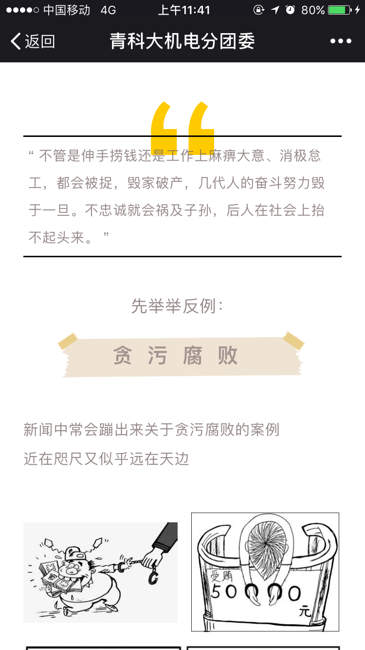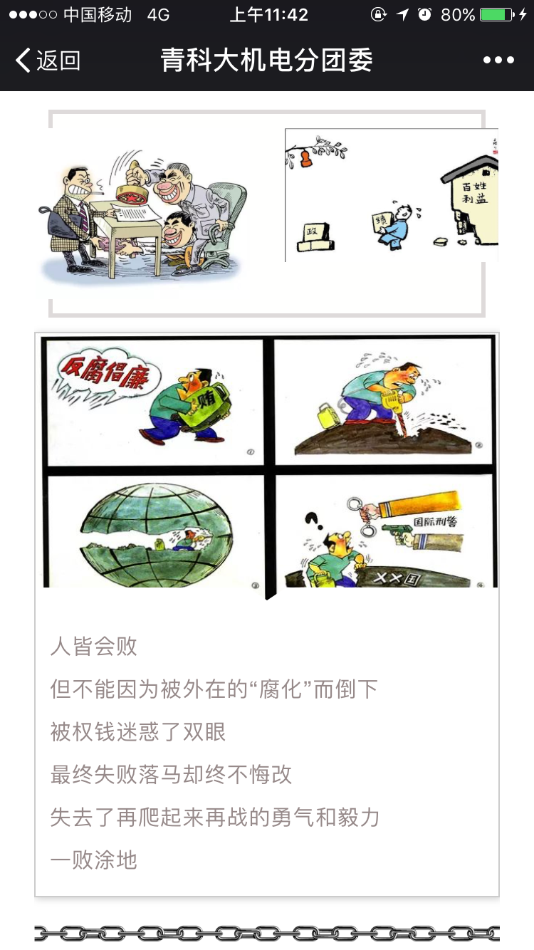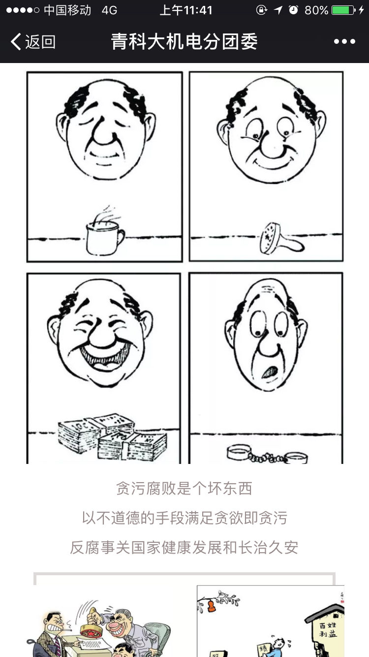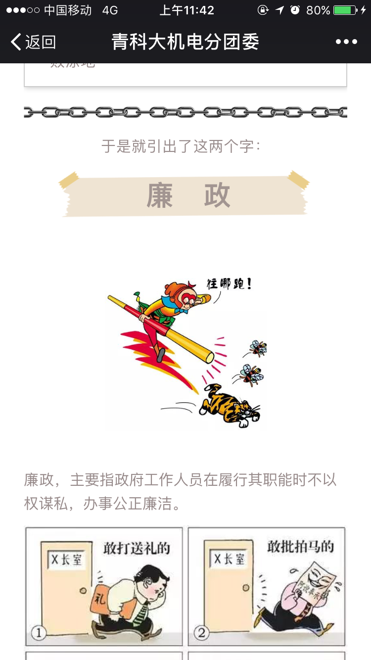 “漫说廉政”以漫画的方式展示“贪污腐败”的问题,进而引出廉政的话题,通过引用古语等方式,切实提高广大教职工的廉政意识。