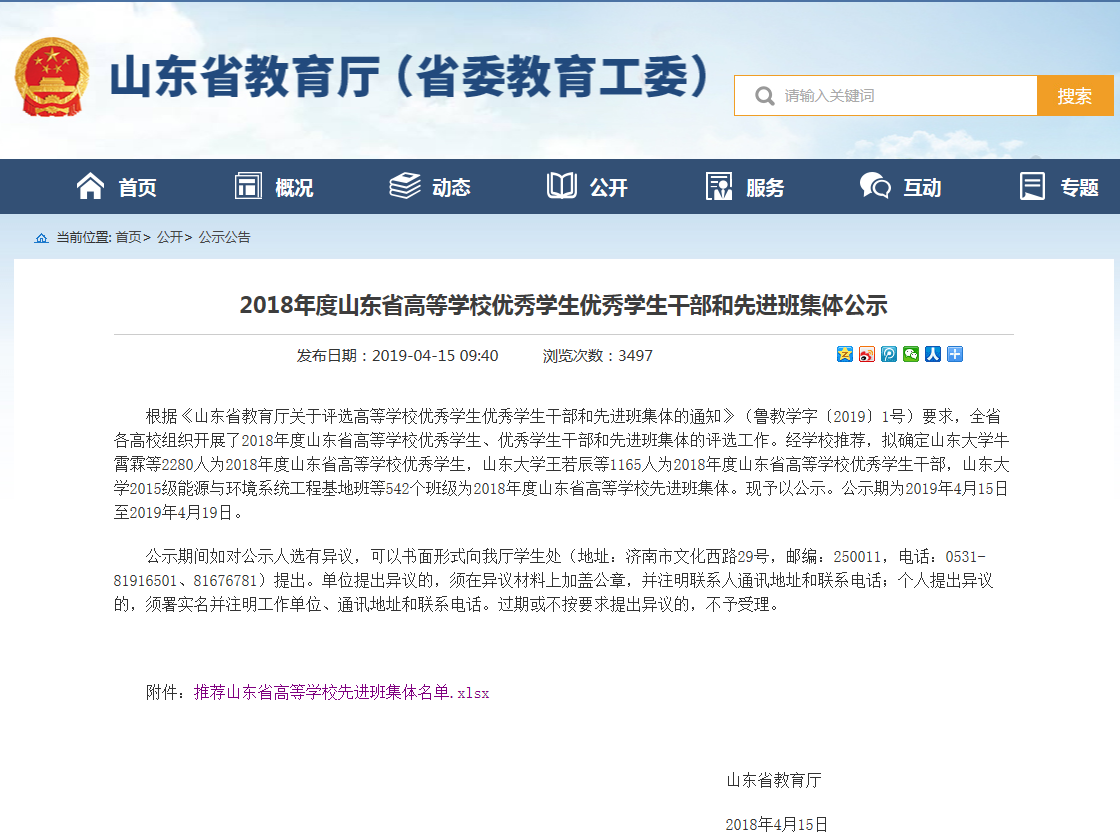 根据《山东省教育厅关于评选高等学校优秀学生优秀学生干部和先进班集体的通知》(鲁教学字〔2019〕1号)要求,全省各高校组织开展了2018年度山东省高等学校优秀学生、优秀学生干部和先进班集体的评选工作。经学校推荐,拟确定山东大学牛霄霖等2280人为2018年度山东省高等学校优秀学生,山东大学王若辰等1165人为2018年度山东省高等学校优秀学生干部,山东大学2015级能源与环境系统工程基地班等542个班级为2018年度山东省高等学校先进班集体。