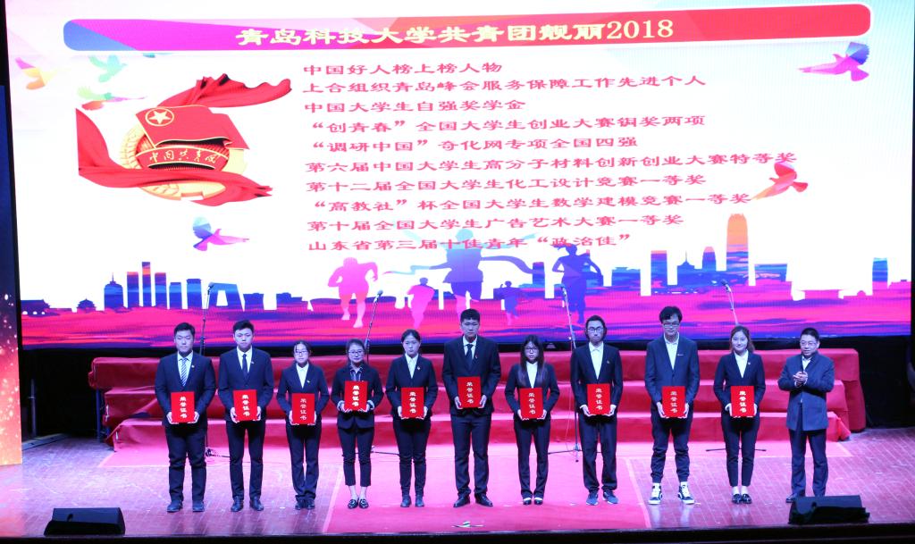 王跃熙和王敏领取了“青岛科技大学共青团靓丽2018荣誉”。机械中韩152班班长王跃熙英勇井下救人,全国各大媒体纷纷点赞,他先后荣获“中国好人榜”、“山东好人之星”等荣誉。能源152班王敏同学,理想信念坚定、学习优异、科创颇丰,获“中国大学生自强奖学金”、山东省“大智之星”奖学金。