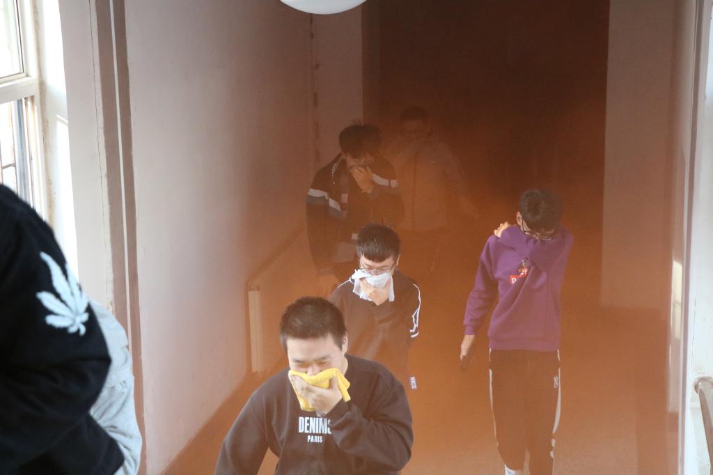 随着急促的警报声响起,演练正式开始。模拟起火地点为北苑三号楼一楼,整个楼道烟雾弥漫,在宿舍的同学们在听到警报后,迅速有序的在楼道站队集合,同学们纷纷用湿毛巾捂住口鼻、俯身迅速从楼梯、疏散通道向楼下空地转移,几百名学生在几分钟内全部安全撤离,各班委、学生会负责同学清点人数无误。本次逃生演习顺利结束。