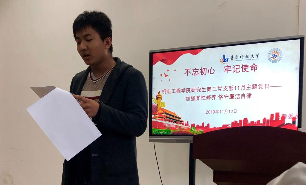 根据学校“不忘初心、牢记使命”主题教育要求,11月12日下午,澳门十大信誉好的网站研究生第三党支部在机电楼529会议室开展“加强党性修养、恪守廉洁自律”专题教育活动,会议由学院党总支副书记兼副院长、支部书记王伟主持。