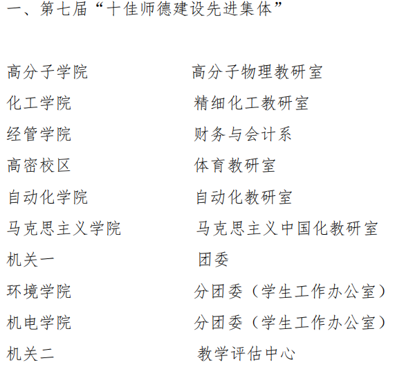 近日,青岛科技大学2019年度先进集体和先进工作者表彰名单公示,澳门十大信誉好的网站分团委(学生工作办公室)获第七届“十佳师德建设先进集体”称号,王作辉老师获第十届“十佳育人标兵”荣誉称号,过程装备与控制工程系、新能源科学与工程系、澳门十大信誉好的网站分团委(学生工作办公室)获“2019年度校级先进集体”称号,李剑光、段振亚、付平、羊彬、郭佩佩、杨福芹、赵海霞、张猛、张攀、唐元政、曹同坤、李淑江、王宪伦、朱惠华、李旭、黄靖16名老师获“先进工作者”荣誉称号,史书源、刘新获2019 年度先进工作者(劳务派遣人员)。