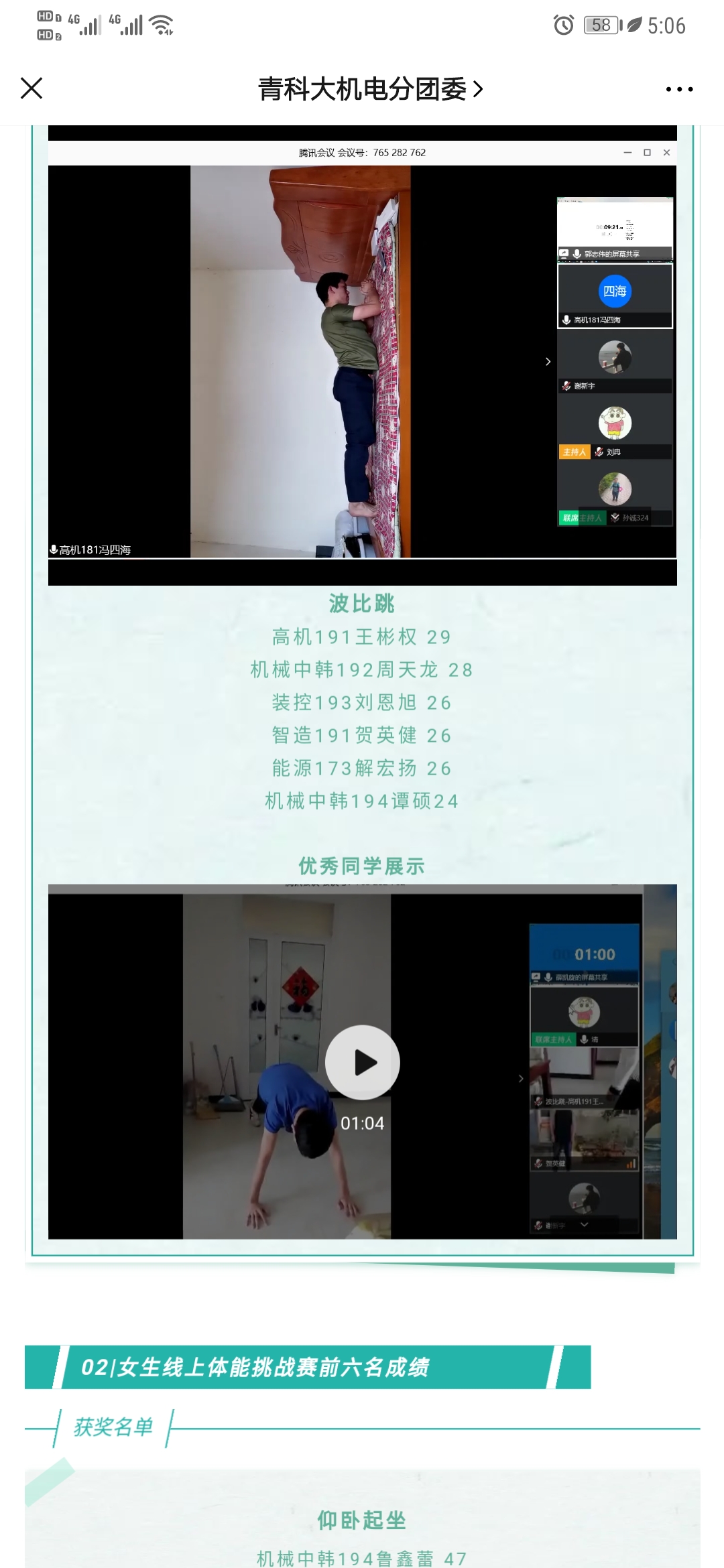 为了响应山东省教育厅和学校关于“线上教育要重视学生心理健康”的工作要求,帮助学生缓解焦虑情绪,活跃学生居家锻炼氛围,澳门十大信誉好的网站举办了“莘莘学子共庆七十华诞,矫健英姿同战疫疠瘟情”线上体能挑战赛。比赛分男子组和女子组,男子组项目有一分钟俯卧撑、一分钟波比跳、平板支撑;女子组项目有一分钟仰卧起坐、一分钟开合跳、平板支撑,活动中,选手们在家运动,线上比赛,不断强健学子体魄。