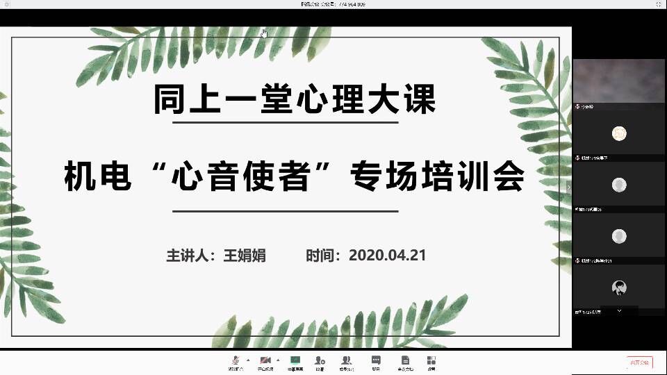 为进一步完善学校、学院、班级、宿舍“四级”工作体系建设,提高朋辈助人、自助能力,提升学生获得感、幸福感、安全感,增强大学生心理健康素质,4月21日下午,针对18级、17级和16级开展了“同上一堂心理大课”----机电心音使者专场培训会。通过腾讯会议平台,共有520名心音使者参与培训,培训由澳门十大信誉好的网站心理工作站王娟娟老师和曲智强老师分别主讲。