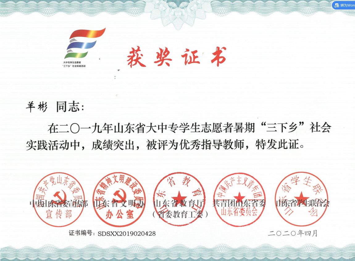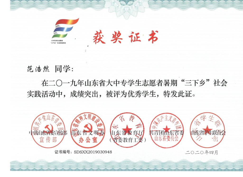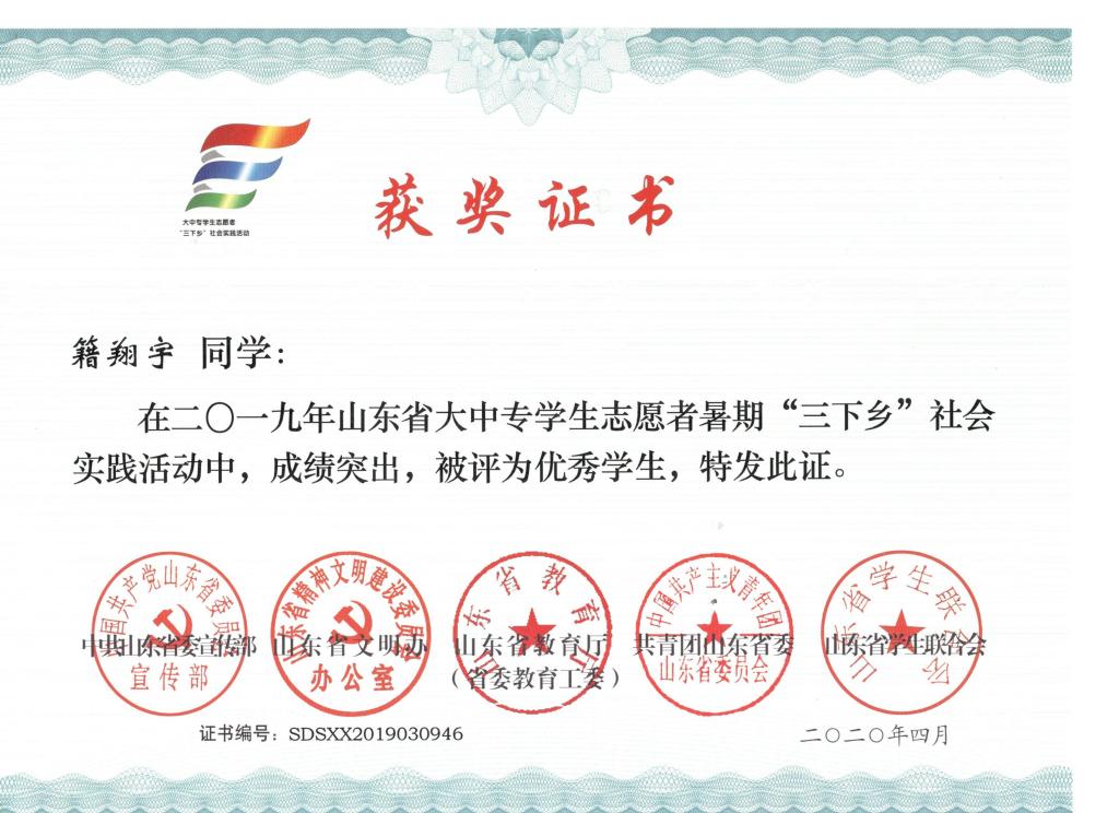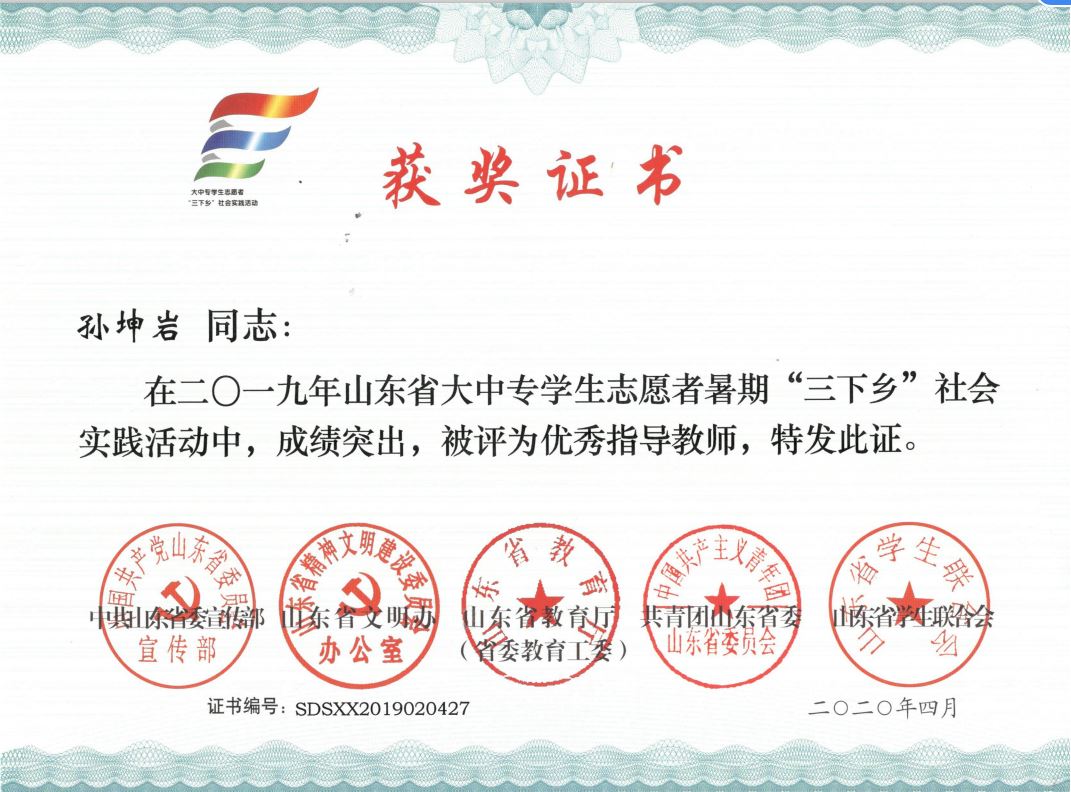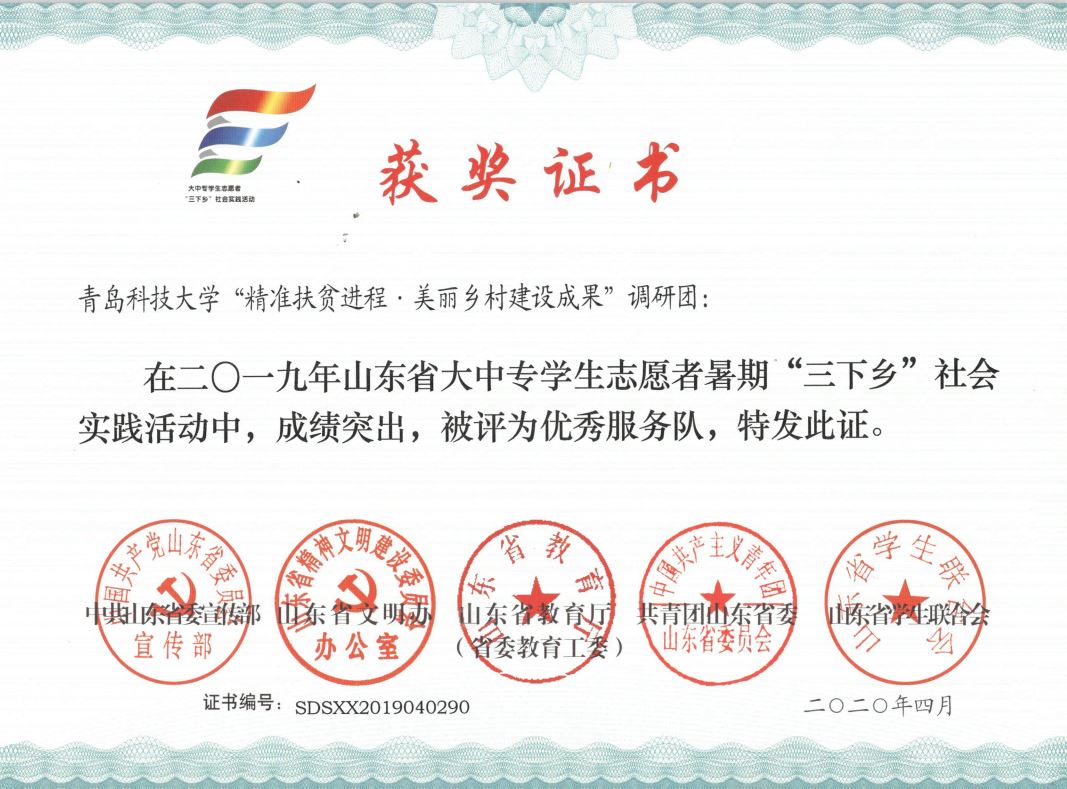 近日,2019年山东省大中专学生志愿者暑期文化科技卫生“三下乡”社会实践活动先进集体和先进个人的证书下发,澳门十大信誉好的网站“青岛科技大学精准扶贫进程 美丽乡村建设成果”调研团、获“三下乡”省级优秀服务团队,孙坤岩、羊彬获“三下乡”社会实践活动优秀指导教师,籍翔宇、张晓楠、范浩然、马晓东获 “三下乡”社会实践优秀学生。