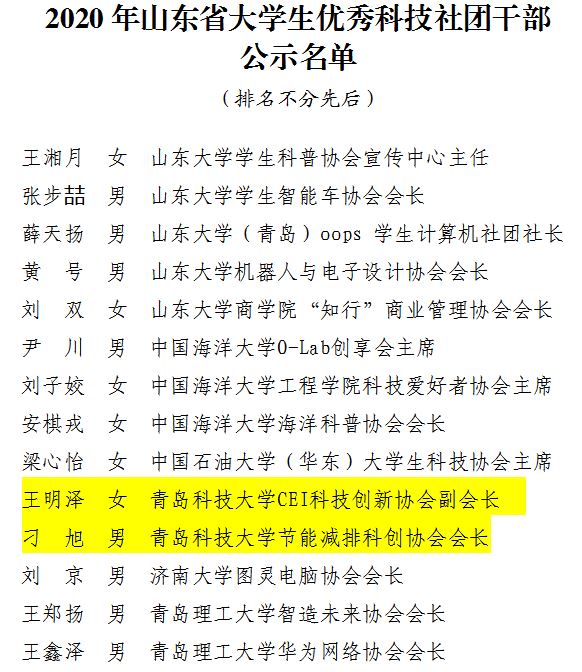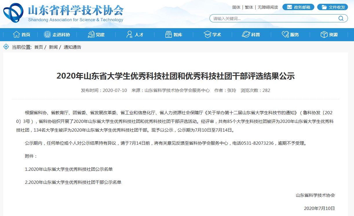 近日,根据省科协、省教育厅、团省委、省发展改革委、省工业和信息化厅、省人力资源社会保障厅《关于举办第十二届山东省大学生科技节的通知》(鲁科协发〔2020〕3号),省科协组织开展了2020年山东省大学生优秀科技社团和优秀科技社团干部评选活动。经评审,共有85个大学生科技社团被评为2020年山东省大学生优秀科技社团,134名大学生被评为2020年山东省大学生优秀科技社团干部。十大信誉官网刁旭同学名列其中。