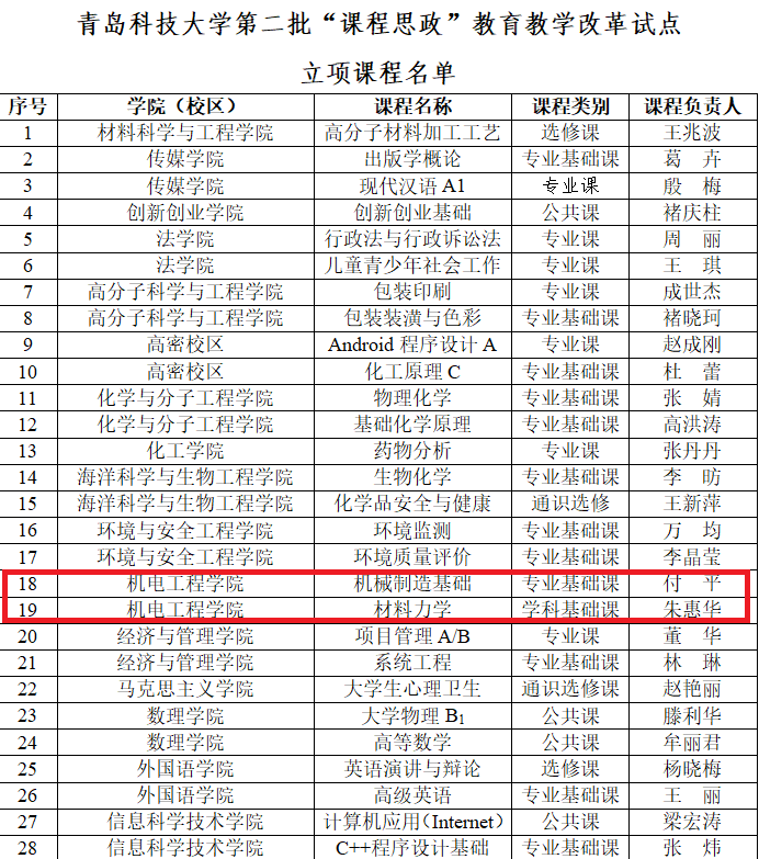 近日,在学校公布的青岛科技大学第二批“课程思政”教育教学改革试点立项课程的通知中,十大信誉官网付平老师的《机械制造基础》与朱惠华老师的《材料力学》两门课程荣获立项。