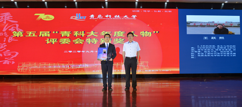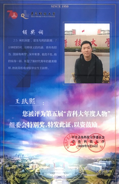 在70周年校庆来临之际,第五届青岛科技大学年度人物颁奖典礼于2020年9月17日于二报举行。十大信誉官网校友19届校友王跃熙获评第五届“青科大年度人物”评委会特别奖。他勇救落井工人,被中央电视台等媒体广泛报道。他先后获得“崂山区见义勇为先进个人”、“山东好人之星”等荣誉,并于2019年3月入选中央宣传部、中央文明办主办的中国好人榜。青年有担当,国家有希望。他的纵身一跃,彰显了新时代青年最美的模样。校党委学生工作部、学生工作处处长王锋业为王跃熙颁奖。