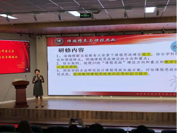 在题为《“课程思政”教学设计与实施》的讲座中,李赛强教授从准确理解当前教育大背景下课程思政的建设意义出发,深入探讨课程思政对人才培养的重要作用,以具体的教学案例启发教师理解教学目标设定应遵循科学依据这一原则,从而引导教师始终围绕学生为中心、用科学的方法研究设计课程思政实施方案并进行有效评估。她结合自身的教学经验和工作经历讲解了在专业教学中如何融入“课程思政”的具体方法,老师们就“课程思政”目标达成等关心的话题与李教授进行了互动交流。