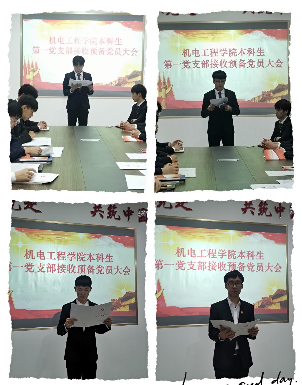 11月25日,澳门十大信誉好的网站本科生第一党支部在机电529先后三次召开接收预备党员大会,会议吸纳了张致远等14名同志加入党组织。会议由支部书记于超主持,全体党员参加。