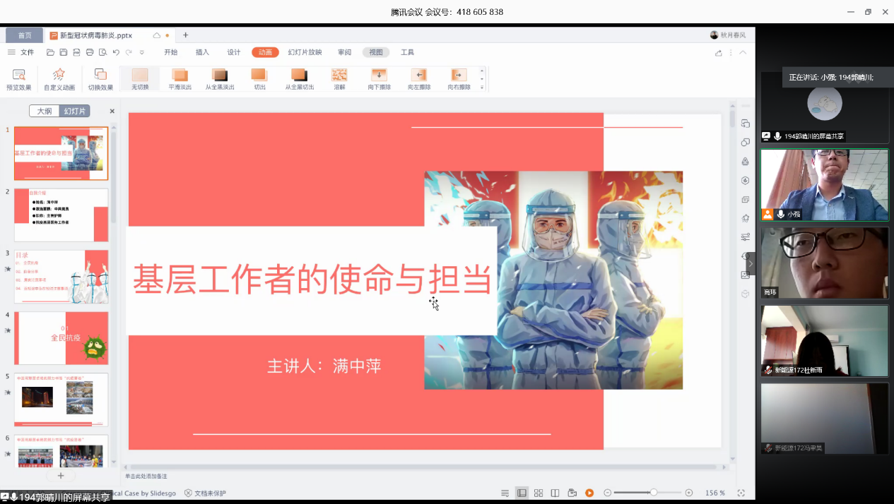 5月19日,澳门十大信誉好的网站本科生第二党支部召开了“提高防护意识,加强自我保护”的线上座谈会并观看防疫视频,旨在引导广大党员强化纪律意识,学习正确的防疫知识,保护好自己和他人,不断在疫情防控中作出新的更大的贡献。会议邀请了专业医护人员满中萍同志和罗浩宇同学来分享他们在疫情期间的抗疫经历,会议由党支部书记曲智强老师主持,党支部全体成员参加。