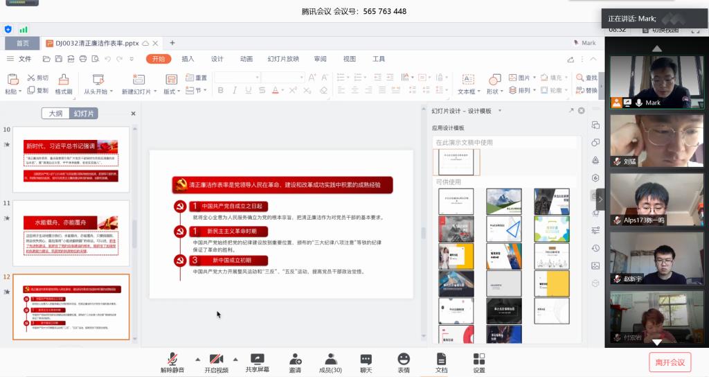 会上,王玉凯领学了《中国共产党重大事项请示报告条例》、《中国共产党党内法规执行责任制规定(试行)》以及《纪检监察机关处理检举控告工作规则》等相关制度法规。与会同学就围绕生活中廉洁工作、新时代廉政文化进行了在线讨论。