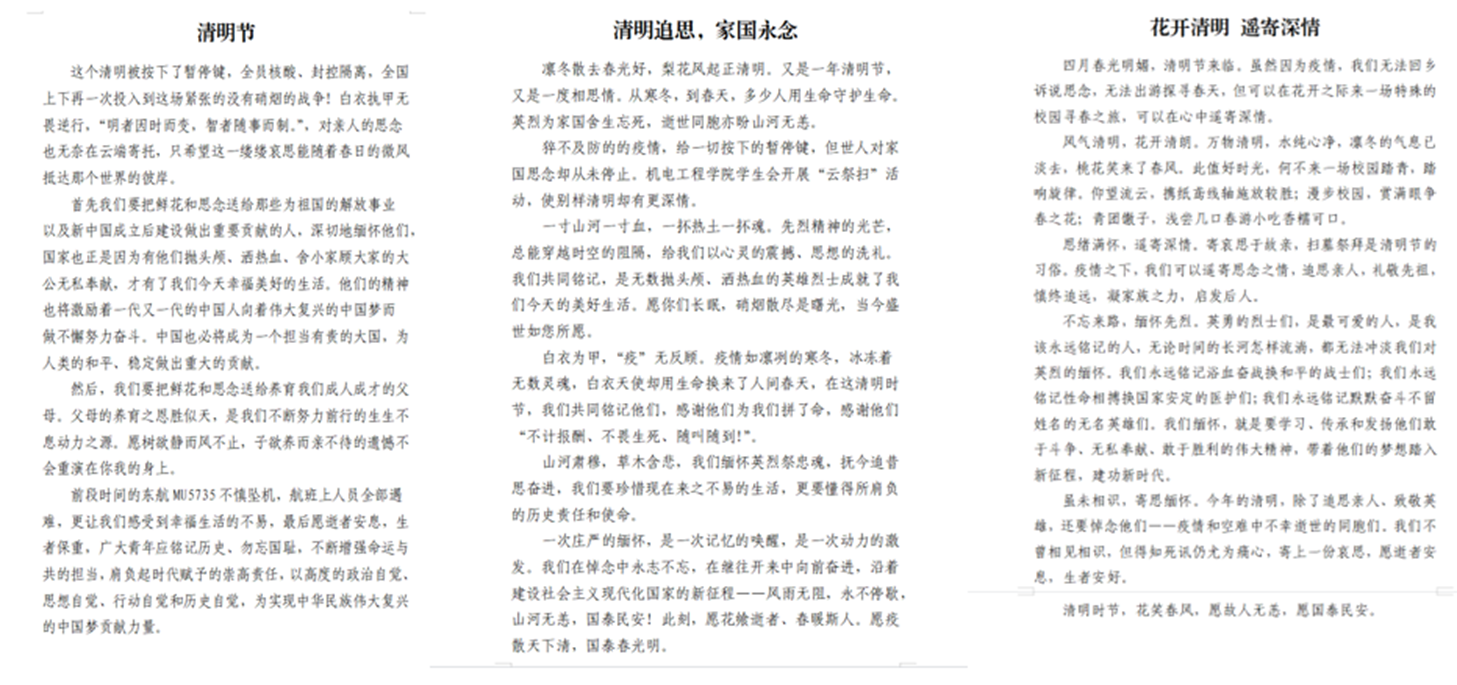 天地英雄气,千秋尚凛然——澳门十大信誉好的网站学生会开展“清明寄哀思”征文活动。组织学生们以笔寄情,与英烈对话,提高思想觉悟,坚定理想信念,汲取不畏强敌、不畏风险、敢于斗争、奋勇向前的勇气与力量。