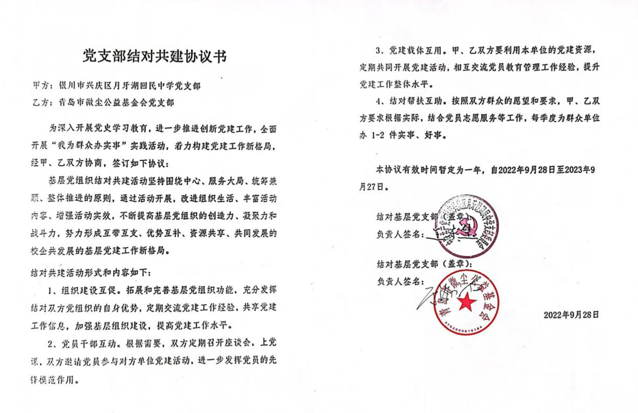 在国庆节来临之际,2022年9月28日青岛科技大学微尘志愿者协会参加微尘基金开展的党建活动。本次微尘与青岛科技大学研支团携手,联合银川市兴庆区月牙湖回民中学党支部结对共建,为困境家庭的孩子提供大学生支教服务。