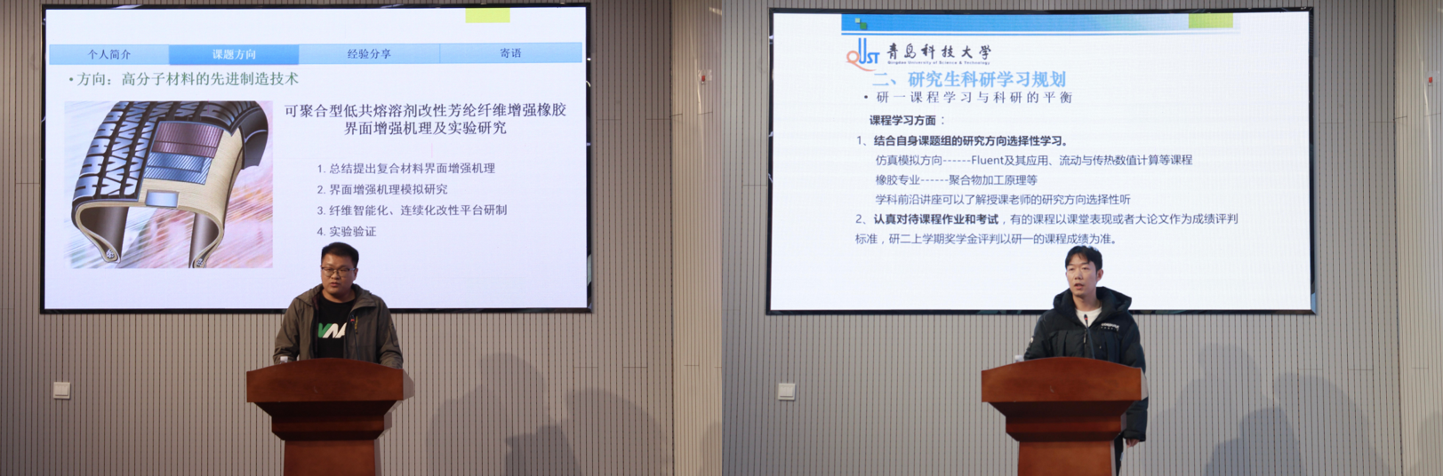 徐辉博士作了题为《可聚合型低共熔溶剂改性芳纶纤维增强橡胶界面增强机理及实验研究》的专题报告。他详细介绍了芳纶纤维作为高性能纤维在橡胶增强领域的广泛应用前景,并深入剖析了相关界面增强的研究机理及实验成果。张达博士则带来了《研究生生涯规划及科研经验交流》专题报告。他结合自身经历,分享了应对研究生阶段学术压力和挑战的策略,强调合理的生涯规划对学术成长和个人发展的重要性,并在论文撰写、简历投递等方面分享了宝贵经验,深受与会师生欢迎。