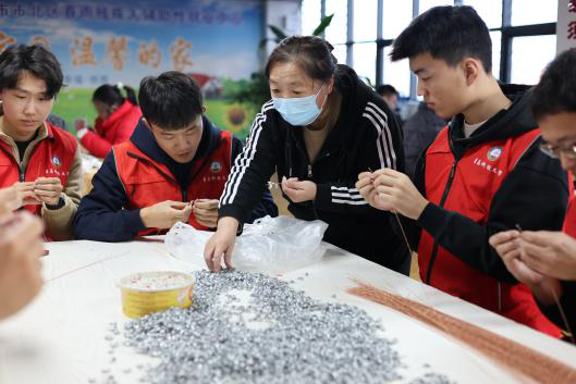 随后,志愿者陪伴蜗牛青年们一起进入工艺车间,学习如何穿耳钉、包装耳钉盒等实践工作,用爱拉近彼此之间的距离,去感受春雨中心给蜗牛青年们带来的关怀和帮助,现场爱意满满。