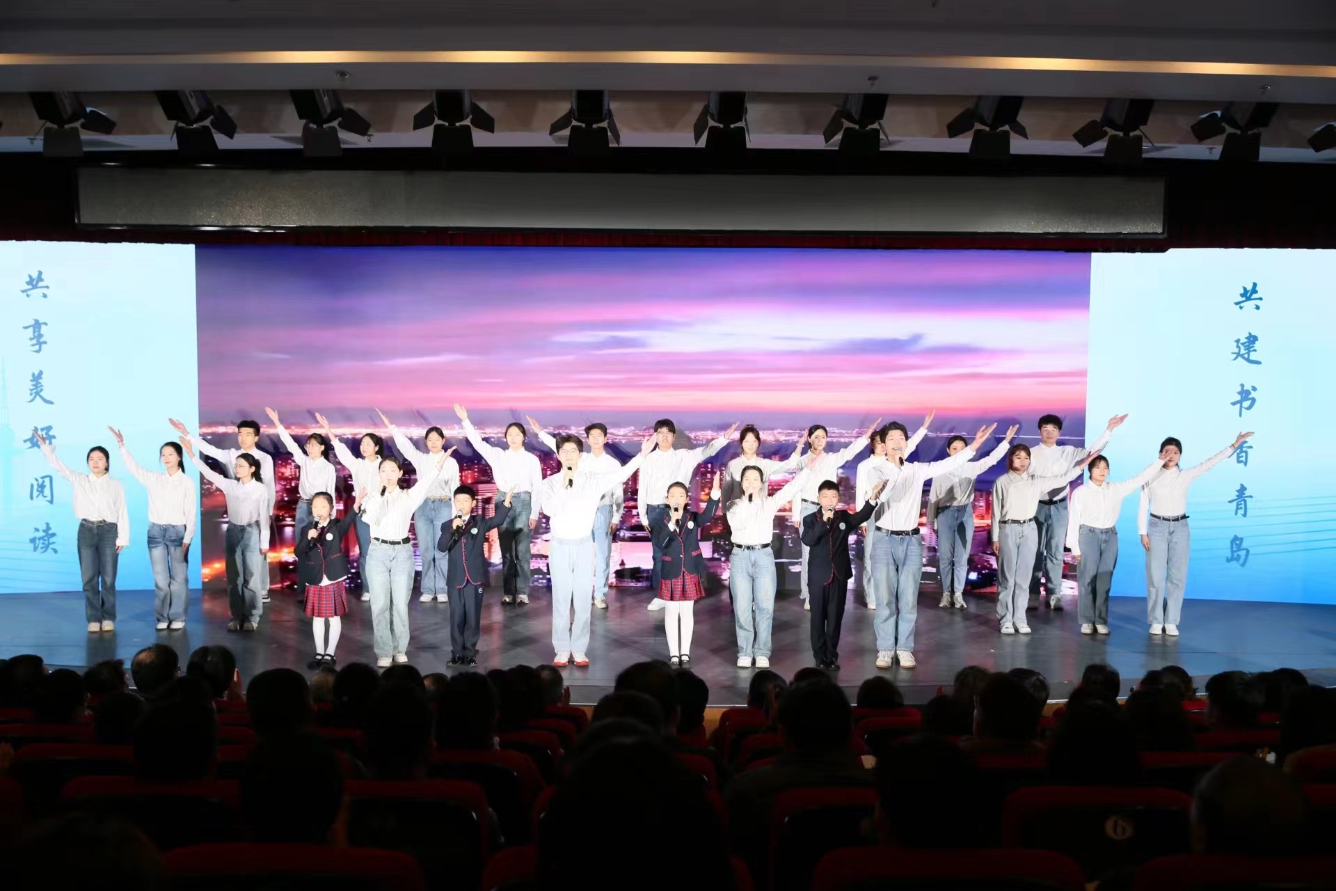 澳门十大信誉好的网站代表徐兴震,何京骏,张学瑞,王俊翰,刘耀泽,张峻琪,李玺辰,孙璇宁一同与“小小阅读推广人”活动获奖选手共同带来开场诗歌朗诵《青岛之书:打开蓝色的乐章》,演绎进程中,小学生们朝气蓬勃、神情专注,大学生们沉稳自信、意气风发,二者共同以饱满且深情的语调,展现了青岛这座城市对阅读的热爱与坚持。