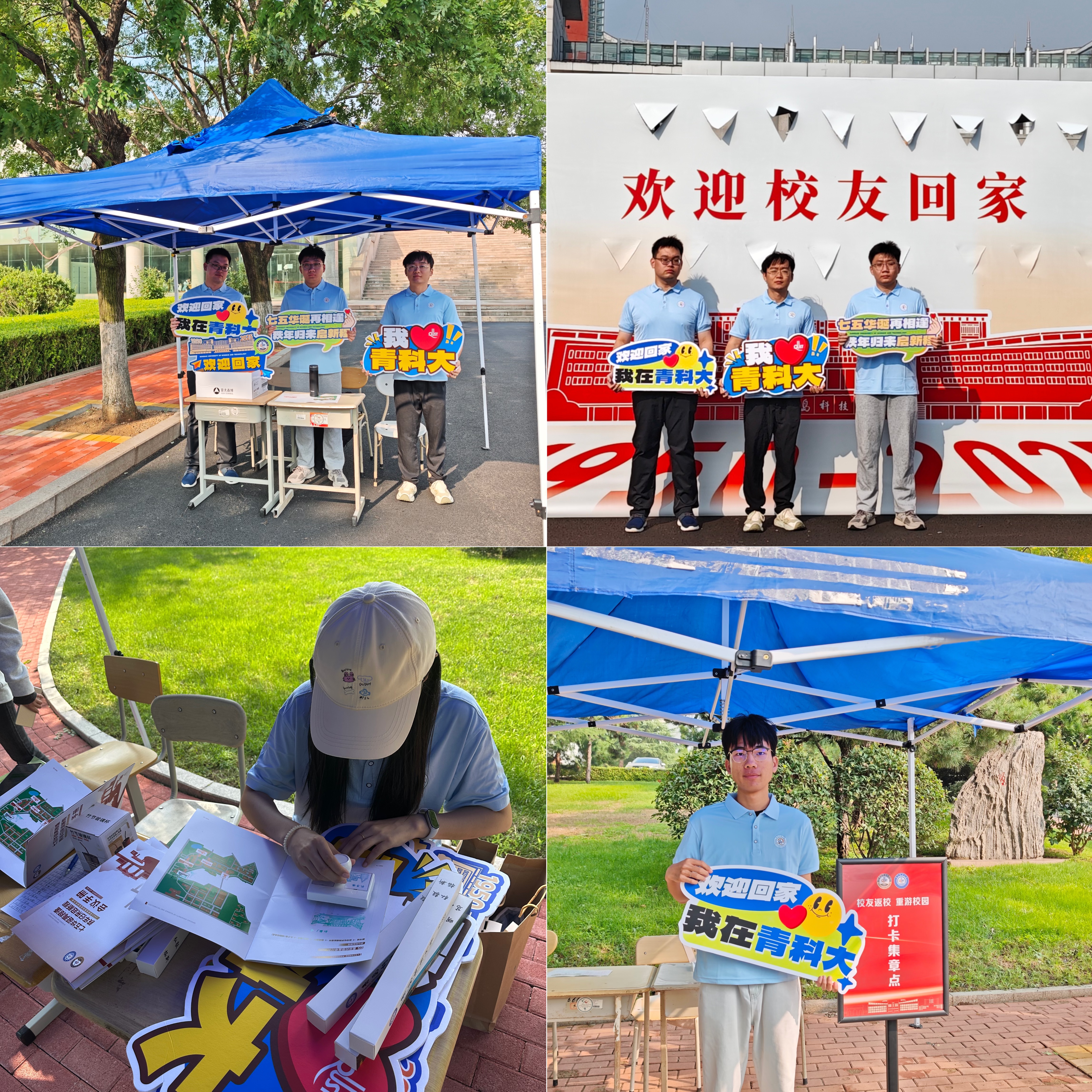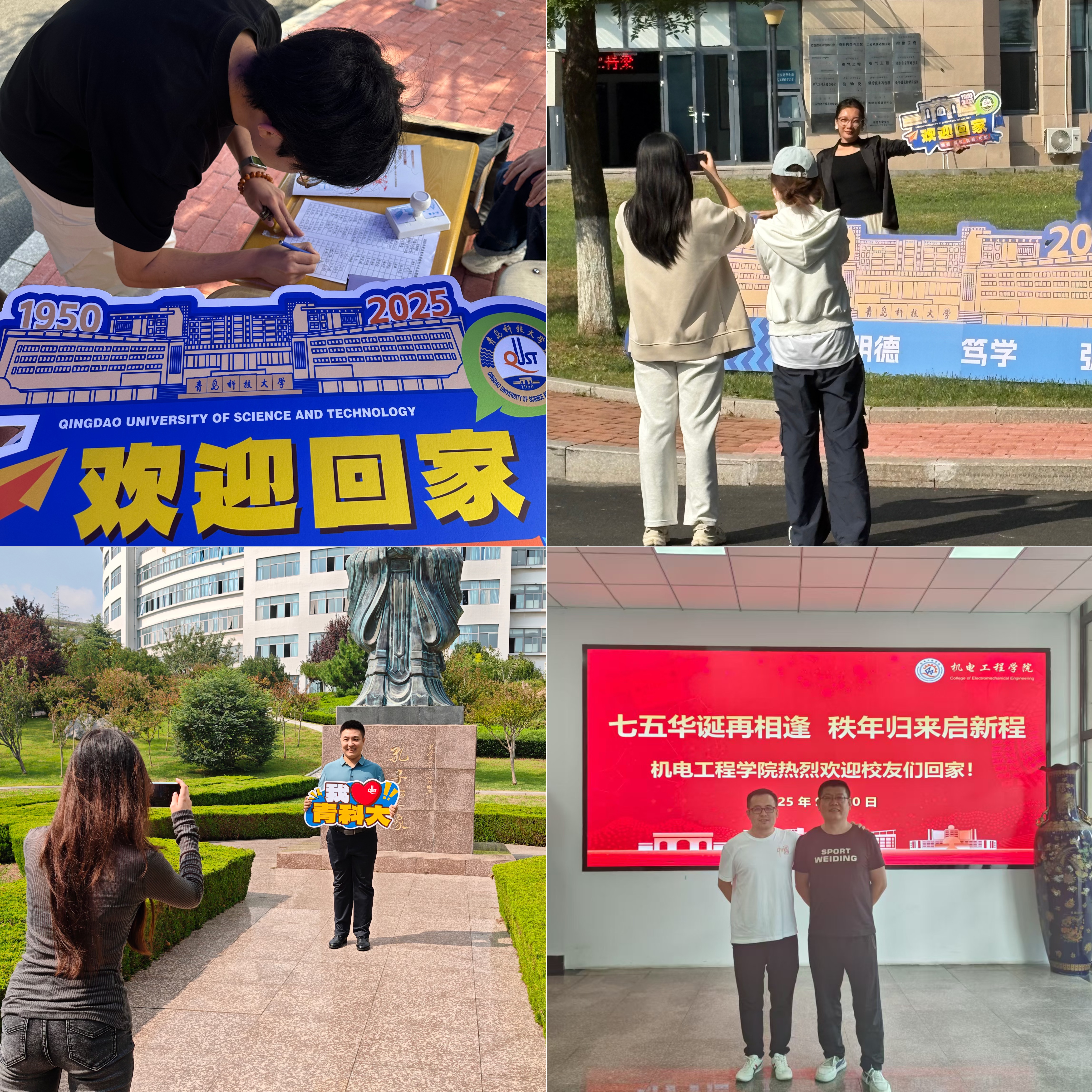 校园打卡点位上,志愿者们的身影成为温暖的注脚。崂山校区正门喷泉旁与图书馆前,志愿者们热情招待校友们“回家”,并协助校友在书香中重温求学时光;自动化学院楼前,志愿者们为校友讲解建筑背后的岁月故事,见证75周年历史印记与笑容的同框;孔子像下,共同感触校训的源远流长;弘毅楼前,细数光影间的青春记忆;南苑食堂里,陪伴校友重拾烟火气十足的校园味道。一个个精心布置的打卡点串联起回忆的脉络,每一枚盖下的印章都沉甸甸地承载着校友对母校的眷恋与牵挂,相机快门声里,一张张笑脸成为校庆最珍贵的纪念。