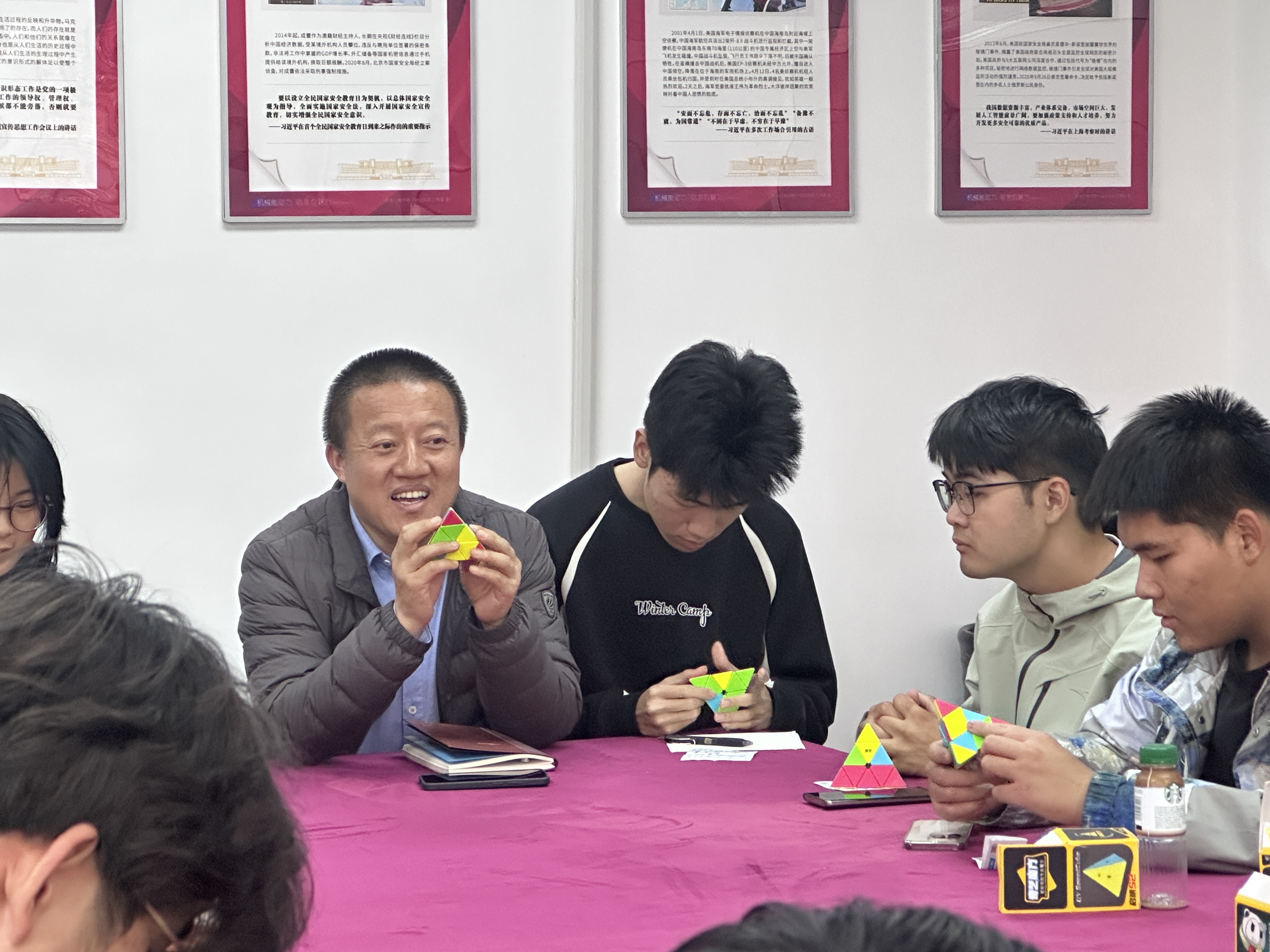 杨小明首先将准备好的三角魔方发给大家,请大家用最少的步数打乱魔方并交给自己右手的同学,同学们饶有兴致的开始复原魔方。随后,同学们纷纷讲解三角魔方里面的成长智慧、机械原理和人生感悟,用三角形的稳定性原理展望美好的大学生活。杨小明指出:三角魔方里面蕴藏着黄金圈法则、三螺旋结构等丰富的科学知识与成长道理,每个人都能够感悟出自己的认识。杨小明从自己的学习工作经验指出,“知识学习—能力提升—反复应用”三者相辅相成、不可或缺,最终才能成就精彩人生。同学们积极参与互动,用三角魔方原理阐释如何做好“宿舍文明建设”“课堂学风建设”“学生组织发展”等,多维度探讨大学生涯的平衡之道。