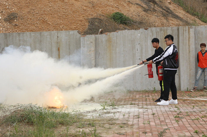 演练开始,指挥长首先为同学们讲解了消防安全应急知识与灭火器使用技巧,教同学们在发生火情时,如何正确地扑救、自救和逃生。随后由同学们自己动手实践,练习使用灭火器灭火。本次演练所用灭火器为干冰灭火器,同学们拨出插销,一手握住开启压把,另一手握住喷射喇叭筒,对准火源喷射,将火源迅速扑灭。学生两人一组完成灭火器使用的练习。全体同学实践练习完成后,此次消防演练顺利结束。