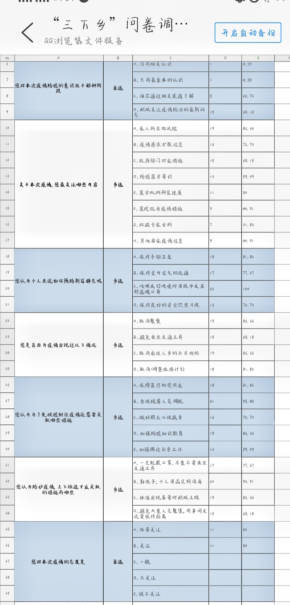 此次问卷调查,主要是对各年龄段,各地区居民对正确防疫措施的考察,截止到8月13日,该团队对回收到的数据进行了整理分析。从整体上看,多数人对于疫情防控态度为积极关注最新动态,其中关注度较高的是疫情感染扩散措施和政府部门的相关应对措施,数据表明居民对疫情发展的关注度和重视度较高。大数据显示,对于疫情防控知识,居民个人表现较好,体现在能主动佩戴口罩,保持良好的安全饮食习惯,避免前往人多的公共场所,交谈时保持一定的距离等方面,表明居民自我防范意识高。另外,从问卷结果来看居民认为做好群众心理疏导,加强防控知识教育以及加强舆论引导工作有助于更好更快的控制稳定疫情。因此,综上所述,尽管个人对于防疫的重视度较高,但科普宣传科学的防疫知识对更多有所缺乏的居民来说也是十分重要的。