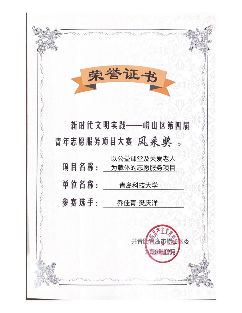 12月17日 ,由青岛市崂山区文明办、团区委和区青年志愿服务联盟联合举办的“新时代文明实践——崂山区第四届青年志愿服务项目大赛”顺利开展。澳门十大信誉好的网站团委志工部部长胡福超老师带领学生代表乔佳青、樊庆洋,积极参与、认真准备,青尘义工队“以公益课堂及关爱老人为载体的志愿服务项目”经作品申报、资格筛选、项目展示、评审打分等环节,最终获得大赛风采奖。
